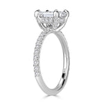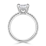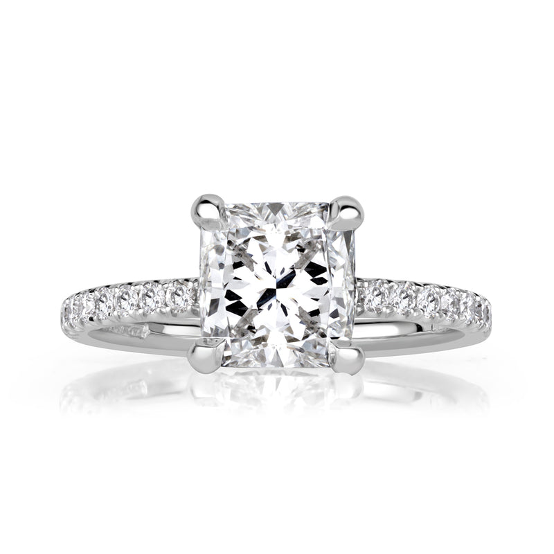 This incredible cushion cut diamond engagement ring is nothing if not dazzling and gorgeous. Featuring a stunning 2.03ct center cushion cut diamond GIA certified at D-SI2, this ring is sure to impress. The diamond sparkles beautifully with it's crisp, brilliant cut facet patterning. It faces up completely colorless and eye-clean, displaying more like a VS+ diamond even under 10x magnification! This beauty measures at an amazing proportion of 7.62 x 7.07mm. The shimmering platinum setting allows the centerpiece to shine and the dainty band of round brilliant diamonds add just the right amount of additional sparkle. Diamonds are also set on our signature hidden halo and up the prongs as well. Give her everything she has been dreaming about with this one of a kind cushion cut diamond ring.