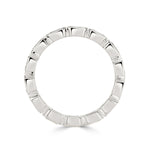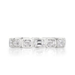 This gorgeous emerald cut diamond band is elegant and unique! Featuring 2.50ct diamonds set all the way around the band, this design features top quality E-F, VS1-VS2 quality diamonds. They will sparkle white and are extremely clean! The diamonds individually weigh at 0.20ct and are encased in a luxurious platinum bezel styled setting. This eternity band is super sleek and chic!