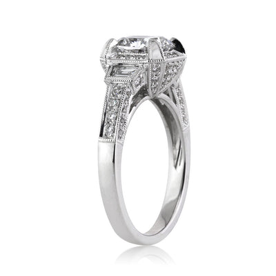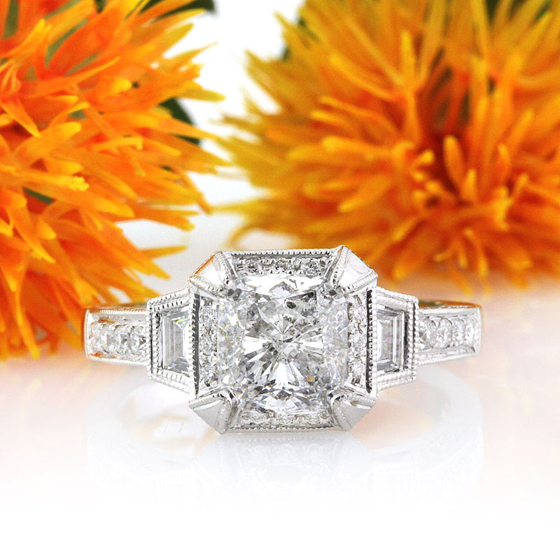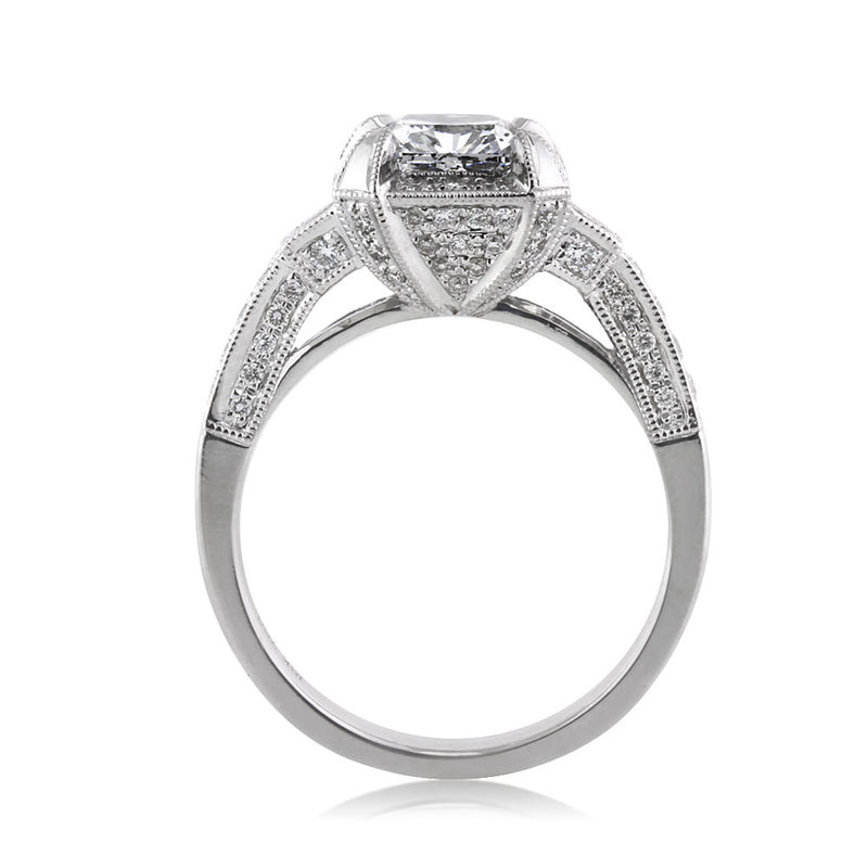 From every angle, this gorgeous cushion cut diamond ring sparkles like mad. The effect starts with the 1.71ct cushion cut showcased in the center. The almost one and three-quarter carat center diamond is IGI certified at E-SI2, colorless and incredibly bright. Its gleaming beauty is noticeably flattered on the custom-made three sided pavé setting. On the 18k white gold setting, two trapezoid diamonds flank the squarish cushion center diamond and more round diamonds embellish the rounded basket. Kick off forever with your sweetheart with this breathtaking cushion cut diamond engagement ring.