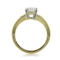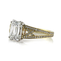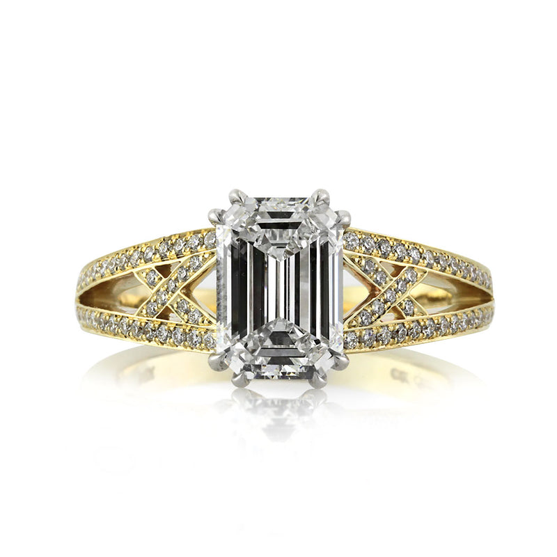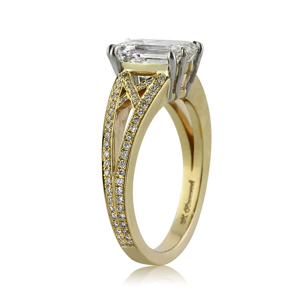 This mesmerizing custom crafted emerald cut diamond ring is magnificently beautiful! The gorgeous 2.01ct emerald cut center diamond is GIA certified at G-VVS1. It is white, practically flawless and has a gorgeous cut. The setting showcases it beautifully with round brilliant cut diamonds set on high polish 14k yellow gold. The diamonds are all pave set to perfection on this gorgeous piece. Truly amazing!