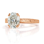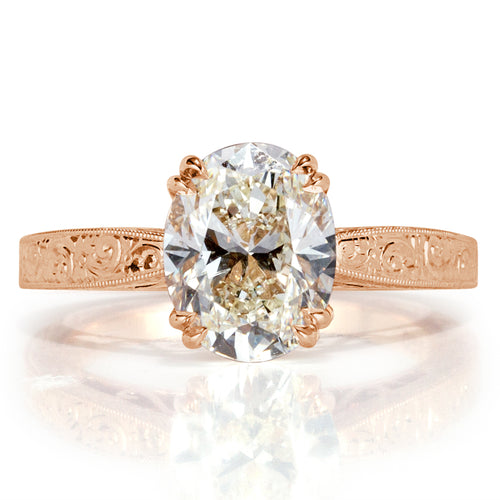 Get the solitaire look you've always wanted but with a more detailed look. The hand engraving on this 18k rose gold setting is intricate and beautiful. It's double eagle claws hold a stunning 2.48ct oval cut diamond that has incredible brilliance. It is GIA graded L-SI1, has a lovely warmth, and is completely eye clean. On the side of the ring are a couple of peekaboo diamonds, fine filligree, and vintage-like milgrain detail.