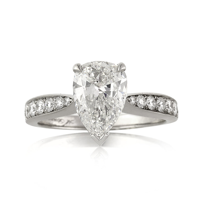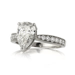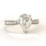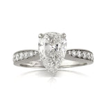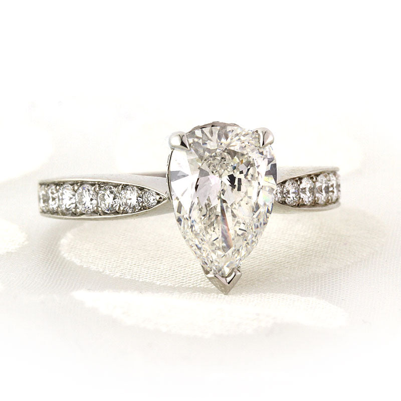 This magnificently beautiful pear shaped diamond engagement ring will mesmerize you with its outstanding quality, clean lines, and outstanding detail! The gorgeous 1.76ct pear shaped center diamond is EGL certified at E-VS2. It is exceptionally white, very clear under 10X magnification and extremely brilliant! The custom-made high polish platinum ring features round brilliant cut diamonds in a pave setting. They graduate smaller as they lead up to the center diamond. The center basket is elegantly designed and studded with round brilliant cut diamonds for an added touch of brilliance. It is absolutely wonderful! You will love it! Get ready for the compliments.