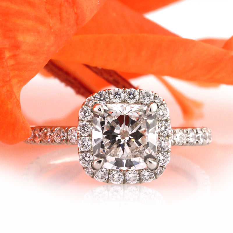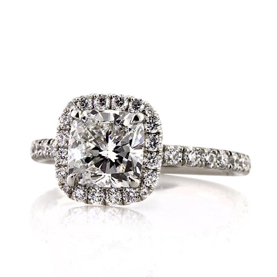 This astonishing cushion cut diamond engagement ring has such an outstanding combination of quality, design, brilliance and beauty! The mesmerizing 1.58ct cushion cut center diamond is GIA Certified, one of the leaders in diamond grading, at F-SI1. It is exceptionally white and perfectly eye clean. The cut is outstanding! It has clear and crisp facets that reflect light in an outstanding way! It is showcased beautifully in this custom made platinum setting featuring a halo of round diamonds set around it and a row of round diamonds set down the shank in a micro pave setting. The diamonds are showcased beautifully with minimal metal showing, giving you a clean, dainty and beautiful look. The center connectors are also studded with round diamonds. It is outstanding from every angle! A perfect symbol of your love and devotion, now and forever.