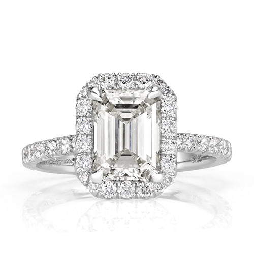 This elegant emerald cut diamond engagement ring will take your breath away! The centerpiece features an incredible 2.01ct emerald cut diamond that is GIA certified at I-VS1, perfectly white and perfectly clear! This beauty measures at 8.57 x 6.26 mm and displays amazing finger coverage! With it's excellent grades in polish and symmetry, it gives off tremendous sparkle. The luxurious platinum setting showcases it beautifully! The design consists of a round brilliant cut diamond halo and a row of round diamonds set down the shank in a smooth micropavé setting. The basket connectors are created in a dainty curved shape and adorned with diamonds as well. With impeccable craftsmanship and the most perfect centerstone, this emerald cut diamond engagement ring is sure to win her heart over!
