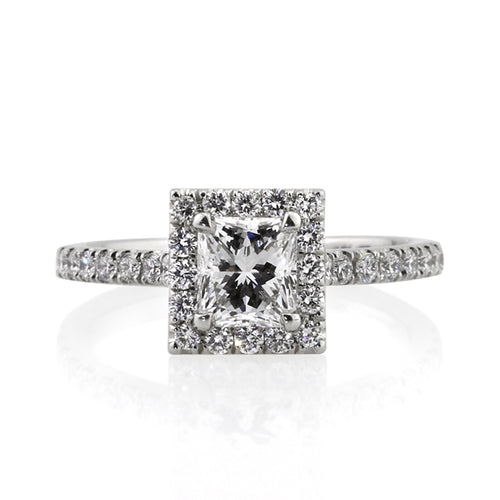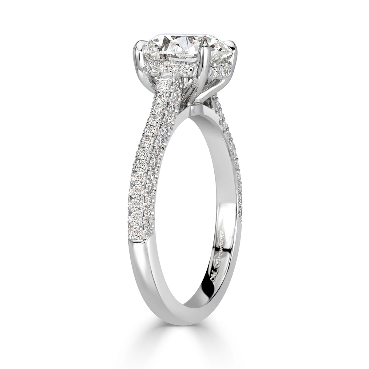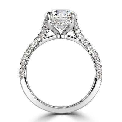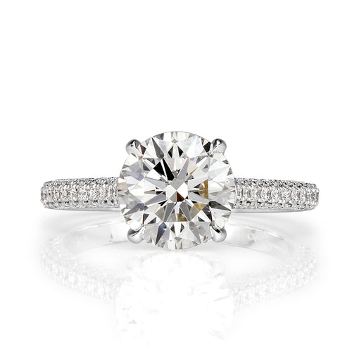 Everything about this platinum diamond engagement ring is breaktaking! The beautiful 2.22ct round brilliant cut center diamond is GIA certified at H-VS2. It is white, perfectly eye-clean and immensely brilliant! The cut, polish and symmetry are all graded at triple excellent, which accounts for it's vivid scintillation. The handcrafted 3-row pavé shank setting gives off a lovely, shimmery look and there are additional diamonds set into the hidden halo of the ring as well. This diamond engagement ring has amazing presence and is sure to be treasured for generations to come.