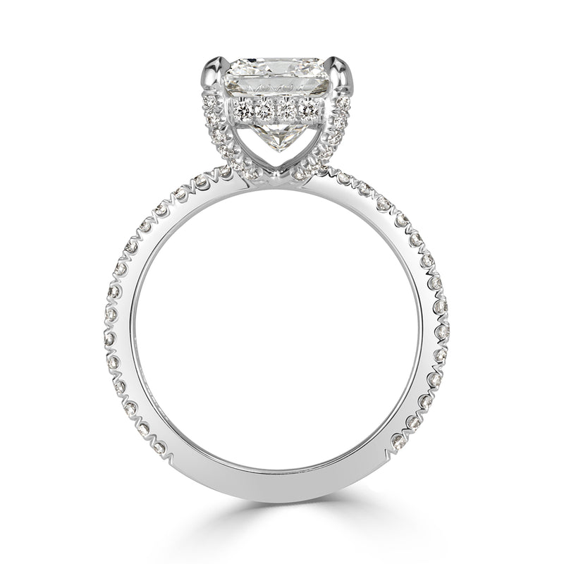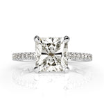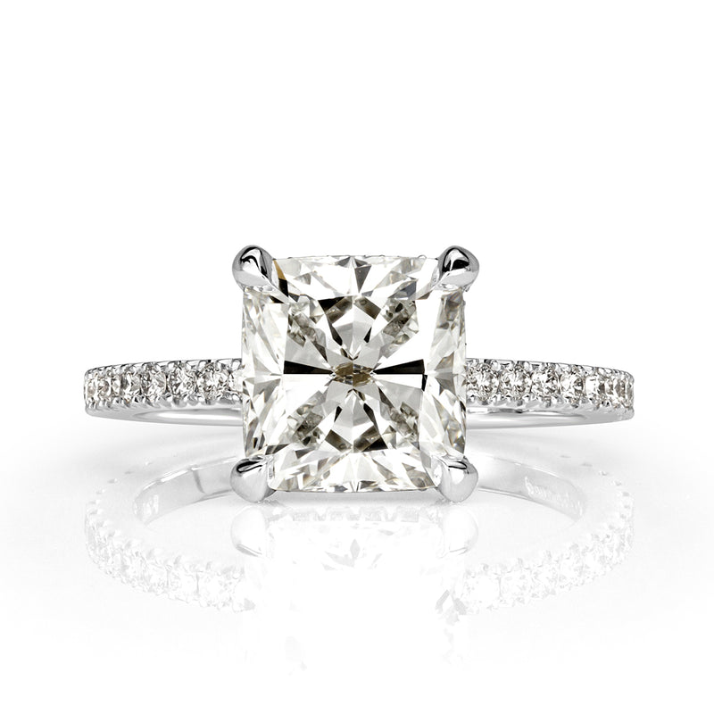 This incredible cushion cut diamond engagement ring is pure perfection. Showcased in the center is a gorgeous 2.24ct cushion cut center diamond GIA graded at H-VVS1. This stone is exceptionally white and nearless flawless in clarity. The cut is superb and boasts crisp facets that account for it's vivid scintillation. This beauty measures at 7.80 x 7.40 mm and is excellence graded in polish and symmetry. It is gracefully embraced by four delicate prongs at the center, with shimmering diamond detail at the basket and attached connectors. The platinum shank design of this piece is accented with shimmering round brilliant cut diamonds. You will never see a more striking diamond than this cushion cut stunner!
