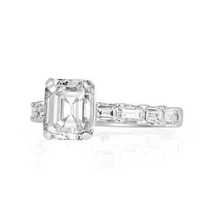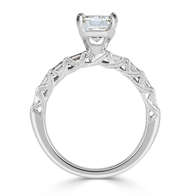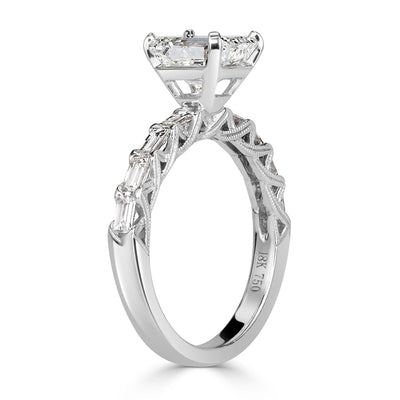 This mesmerizing emerald cut diamond engagement ring is set with an exceptional emerald cut center diamond, EGL certified at G-VS1. It is white and perfectly clear, even under 10X magnification! The cut and faceting are outstanding and it sparkles beautifully! It is accented by one row of baguette cut diamonds going down the 18k white gold shank. The front and back of the ring equally features a very unique design with gorgeous milgrain detail throughout. Get ready for the compliments with this truly one-of-a-kind diamond engagement ring!
