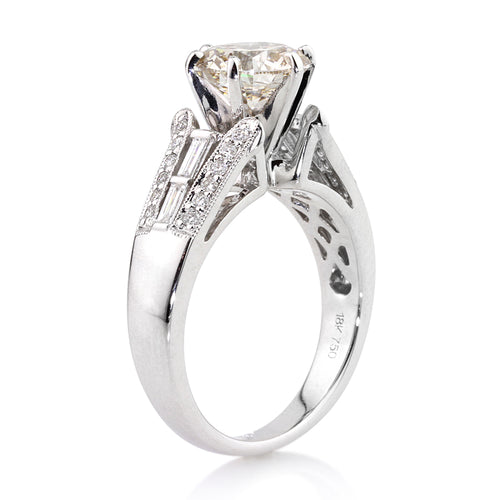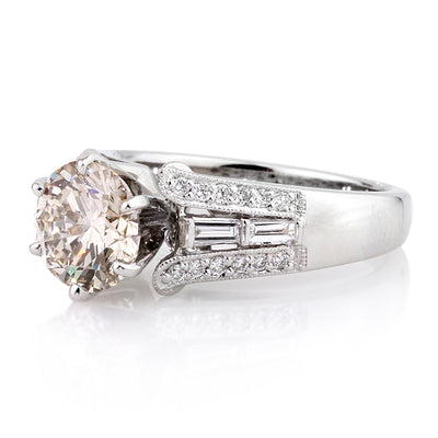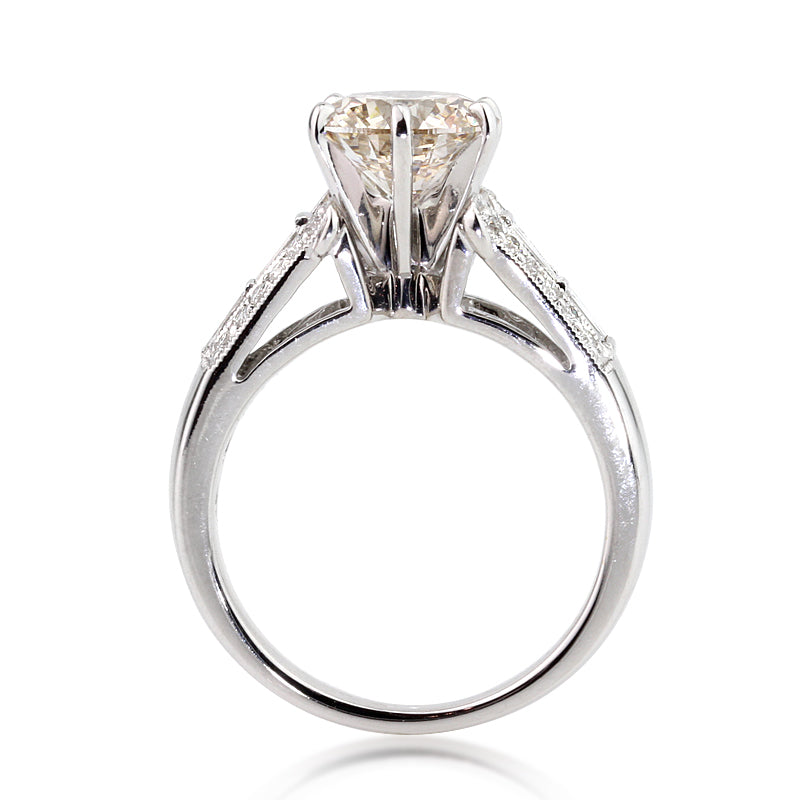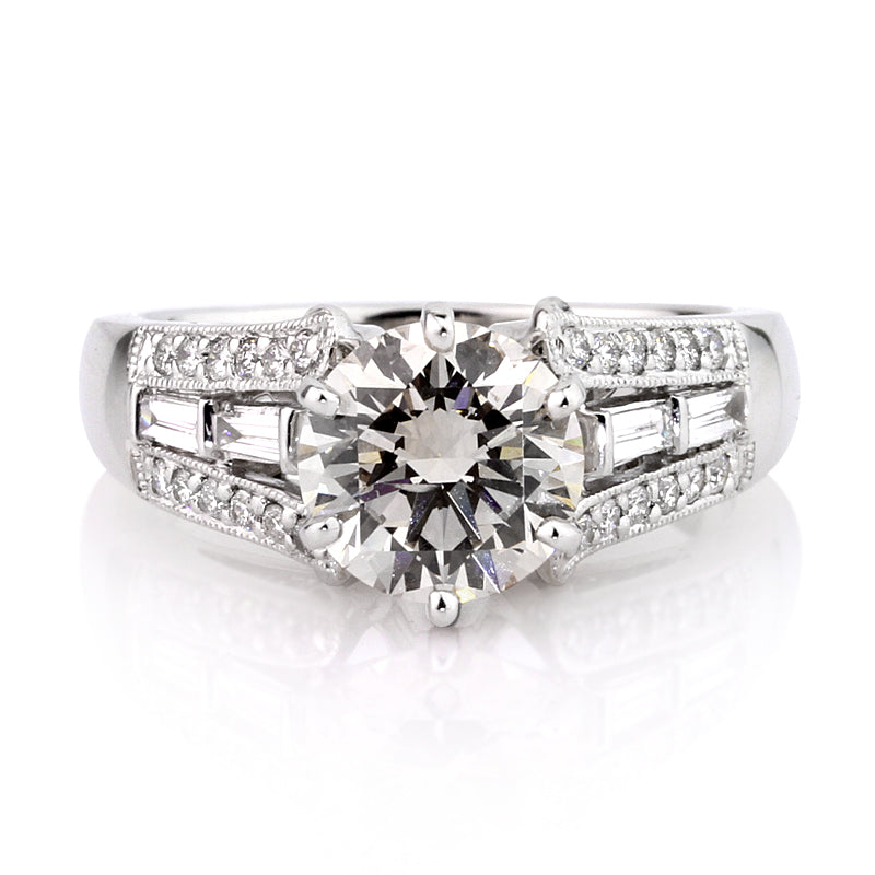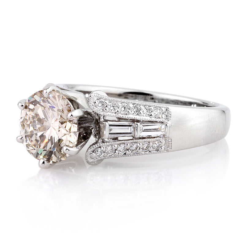 This stunning round brilliant cut diamond ring gives you such an awesome combination of size, quality and design at an incredible price. The 2.11ct round brilliant cut diamond set in the center is EGL certified (one of the leaders in diamond grading) at K-SI1. It has a warm color to it, and it is perfectly eye clean. The diamond has a very small white feather that is hardly visible under 10X magnification and looks like a lot of VS quality diamonds you will see! The cut is outstanding as well. It sparkles like crazy! It is accented by two rows of round diamonds that are pave set on each side and there are two baguette cut diamonds prong set in between them. It has a stunning design, amazing presence and incredible fire and brilliance at an outstanding price! It does not get better than this!