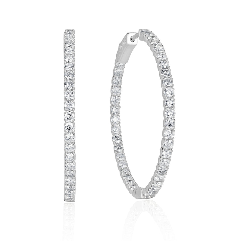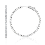 This classy pair of diamond hoop earrings is perfect for daily wear or a dressy night out! They are set with 2.73ct of round brilliant cut diamonds on a luxurious 14k white gold. These stunners are set with exceptionally white and brilliant diamonds on the front and back sides of the earring. Measures 1.25 inches from top to bottom.