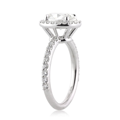 Enchant your fiancé with this marvelous oval cut diamond engagement ring. The 2.00ct oval cut center diamond is EGL certified at G-VVS2. The two carat center diamond is white, virtually flawless, and sparkles beautifully! The elegant 18k white gold shared-prong setting features round diamonds in the halo and on the sides of the engagement ring. The ring has clean smooth lines and a high polish finish. This oval cut diamond ring is extraordinary from top to bottom!