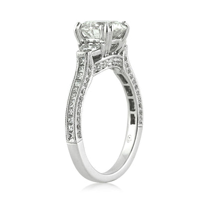 This profoundly beautiful round brilliant cut diamond engagement ring possesses fine craftsmanship and incredible brilliance. The 1.76ct round brilliant cut diamond in the center is EGL certified at I-SI2. The over one and half carat center diamond has a slightly warm color but the brilliance of the stone compensates nicely. It is set on an 18k white gold setting and flanked by half moon diamonds. The rest of the ring is set with pavé set round brilliant cut diamonds on all three sides. For extra beauty, milgrain detail has been engrained throughout. This truly magnificent round brilliant cut diamond ring will certainly become an heirloom!