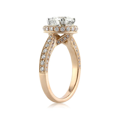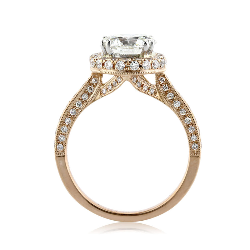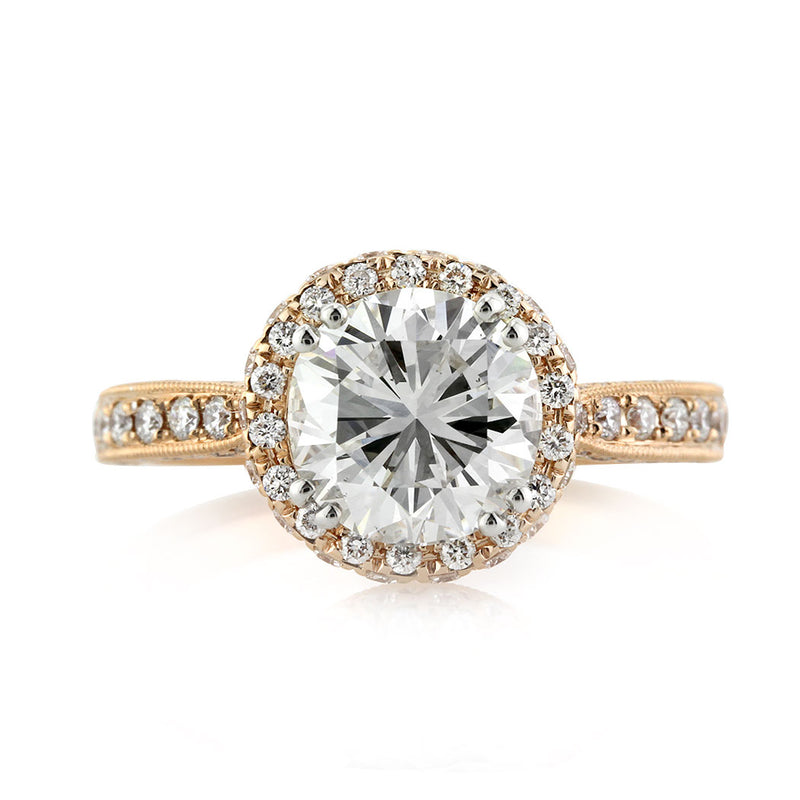 The combination of rose gold and white diamond on this round brilliant cut diamond engagement ring is exquisite. The designer setting features a 1.96ct round brilliant cut diamond GIA graded at I-SI1, a very balanced color and clarity combination. It faces up completely white and is perfectly eye clean. Under 10x magnification, it looks like a VS2! The diamond is cut beautifully and looks larger than a two carat diamond. The gorgeous center stone is set atop an extraordinary two-sided micro pavé halo. The shank is adorned with diamonds on three sides and the elegant connectors are also set with round diamonds. For extra fine detail, milgrain is rolled throughout this 18k rose gold setting. This spectacular round brilliant cut diamond engagement ring will be a timeless, much admired piece for generations to come.