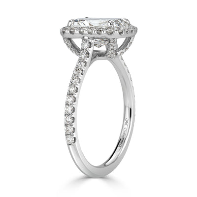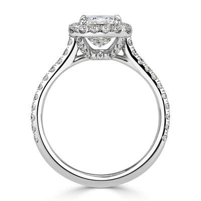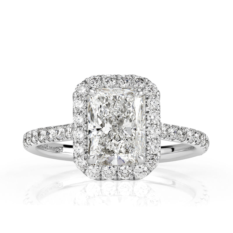 This astonishing radiant cut diamond engagement ring will mesmerize you with its pure color, craftsmanship, and outstanding brilliance! The 2.02ct radiant cut center diamond is GIA certified at E-SI1. It is exceptionally white, it has the most mesmerizing cut and you can see the sparkle from a mile away! The elongated shape is so beautiful. It is accented by round brilliant cut diamonds set around it and down the sides in a micro pave setting. The center basket is studded with round diamonds as well. This dainty and beautiful ring showcases the diamonds perfectly with very little metal showing. You will cherish it forever.