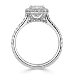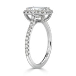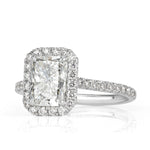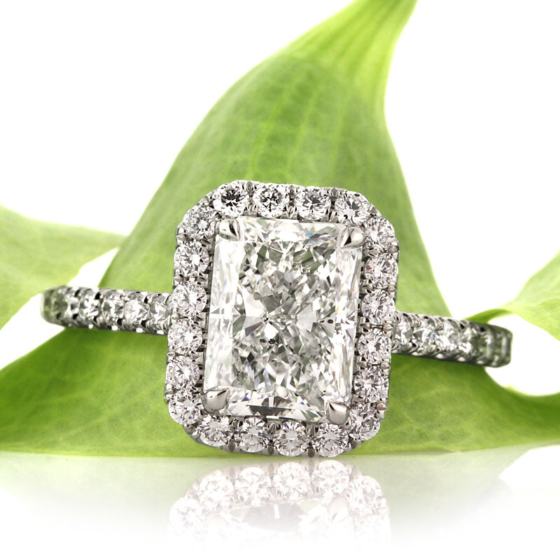 This astonishing radiant cut diamond engagement ring will mesmerize you with its pure color, craftsmanship, and outstanding brilliance! The 2.02ct radiant cut center diamond is GIA certified at E-SI1. It is exceptionally white, it has the most mesmerizing cut and you can see the sparkle from a mile away! The elongated shape is so beautiful. It is accented by round brilliant cut diamonds set around it and down the sides in a micro pave setting. The center basket is studded with round diamonds as well. This dainty and beautiful ring showcases the diamonds perfectly with very little metal showing. You will cherish it forever.