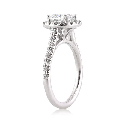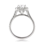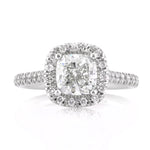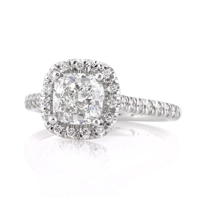 This cushion cut halo diamond engagement ring is simple, elegant and very brilliant! The stunning 2.00ct cushion cut center diamond is GIA certified at H-VVS2. The two carat center stone is white, practically flawless and exceptionally sparkly! It is surrounded by a halo of round diamonds and a row of round diamonds set down the sides. The ring is made in high polish platinum. A quality piece with an exceptional combination. You will love it!