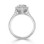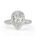 This exquisite pear shaped diamond has such an excellent combination of cut, quality and brilliance! This 2.01ct pear shaped diamond is GIA certified at E-SI2, perfectly white and eye-clean! The cut is outstanding and it is immensely brilliant! It is very difficult to find such an excellent combination of size and quality in pear shaped diamonds. It is really a one-of-a-kind gem with it's remarkable proportions of 10.81 x 7.32mm. The custom-made platinum setting features a halo of round brilliant cut diamonds set around the stunning pear shape in a micropavé setting and a row set down the shank. The center basket features finely detailed handmade filigree accents with diamonds studded on the connectors. This astonishing pear shaped diamond engagement ring will surely leave her speechless and in love.