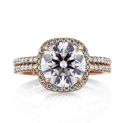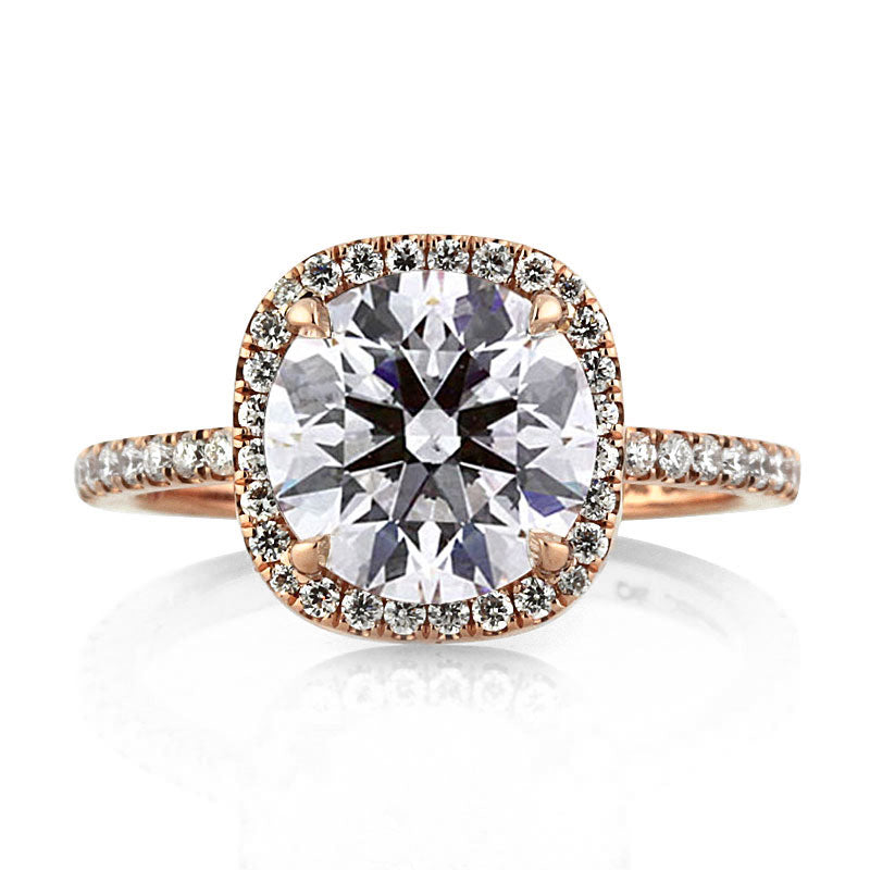 Rose gold and white diamonds make for a beautiful, elegant combination on this halo diamond ring. Featured at the center of this engagement ring is a 2.04ct round brilliant cut diamond GIA certified at F-SI1. The two carat center stone has an extremely brilliant cut and faces up colorless. It is set in a cushion shaped halo micropave 18k rose gold setting. There is also a row of micropave round diamonds set down the dainty shank. The design of the ring allows for a matching band to sit completely flush with the engagement ring for a sleek, clean look. This round brilliant cut diamond engagement ring will stun audiences for a lifetime!