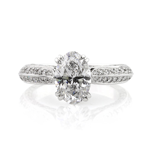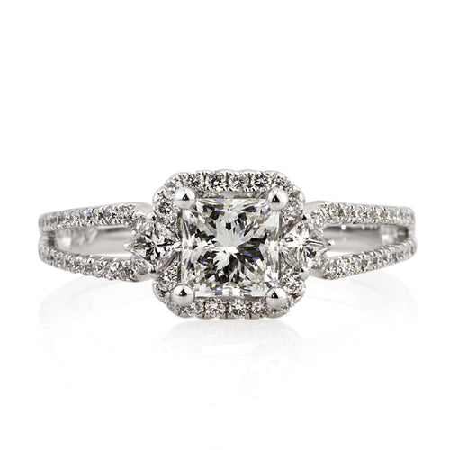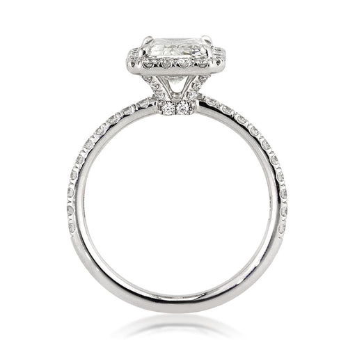 This breathtaking emerald cut diamond engagement ring is one in a million! It all starts with the magnificent 2.01ct emerald cut diamond set in the center. It is GIA certified, one of the leaders in diamond grading, at G-SI1. It is white and perfectly eye clean. This diamond is really one in a million. The diamond has a small white feather, which makes it an SI1 but even under 10X magnification it looks like a VS1! The cut is outstanding as well. It gives you tremendous value. The custom-made platinum setting features a halo of round diamonds showcasing the center diamond perfectly and a row of round diamonds set down the shank in a micro pave setting. The curved connectors are also studded with round diamonds for added brilliance from the sides. This dainty and elegantly designed setting is spectacular from every angle. You will cherish it forever!