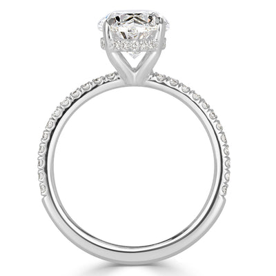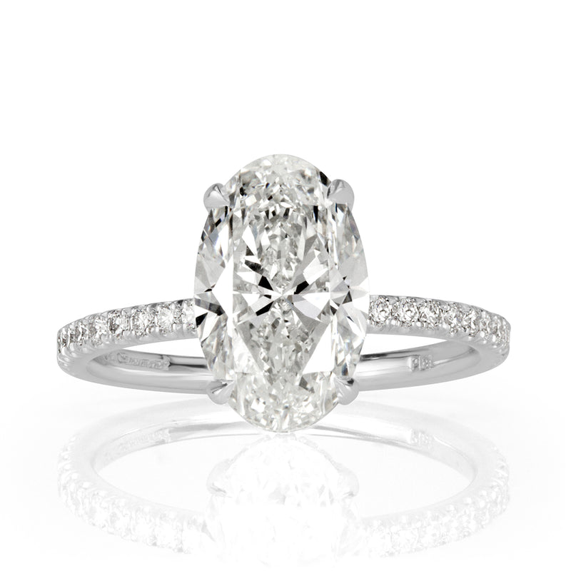 Shine bright like a diamond with this incredible oval cut diamond engagement ring. It features a 2.53ct oval cut diamond that is GIA certified at F-VS2, with incredible measurements of 11.47 x 7.41 mm. It's extraordinarily white, perfectly eye clean, and graded at excellent in both polish and symmetry. The beautiful diamond sits on top of a handcrafted platinum setting, with round brilliant cut diamond accents down the shank and on the hidden halo underneath. For the girl that wants to sparkle till the end of time, this is the ring for you!