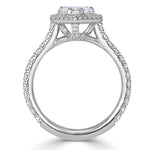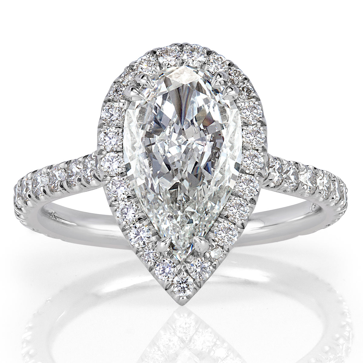 Only a handful of pear shaped diamonds in the world are cut with as much beauty as this one. This charming 2.01ct pear shaped center diamond is GIA certified at G-VS2. The diamond is beautifully white face up and is exceptionally eyeclean to the naked eye. The elongated cut of this pear shape is one of stunning sophistication and allows the finger to look long and dainty. It is adorned by 0.85ct of sparkling round brilliant cut diamonds in a lovely halo setting as well as diamonds going up the basket connectors and down the shank. This piece is sheer elegance in every way!