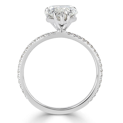 Premium quality, elegant design and classic beauty are all checked off in this platinum pear shaped diamond engagement ring. The ravishing 2.55ct pear shaped center diamond is GIA certified at H-SI1, beautifully white and perfectly eyeclean. The spectacular cut on this two and a half carat center stone allows the diamond to shine with intense scintillation and fire. It is set in a dainty setting accentuated by glimmering round brilliant cut diamonds set in micro pave going down three-quarters down the shank. This lovely masterpiece is sure to capture her heart for forever and always!