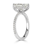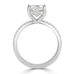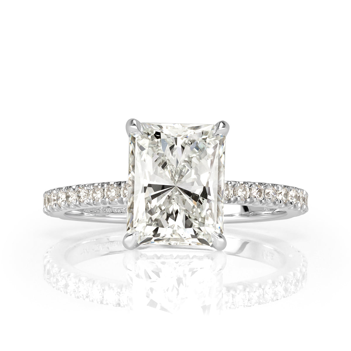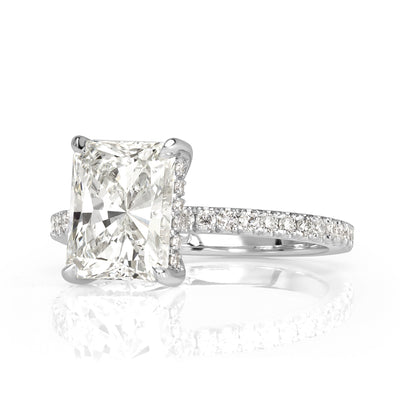 This dazzling radiant cut diamond engagement ring is the ultimate statement of chic elegance. The gorgeous 2.50ct radiant cut center diamond is GIA certified at G-VS2. It is exceptionally white, perfectly eye clean, and immensely brilliant. It measures at an incredible proportion of 9.05 x 6.84 mm and shows off a stunning elongated shape. The centerpiece is complimented by our signature hidden halo design peeking out from below. For additional sparkle, the platinum shank is also accented with round brilliant cut diamonds pavéset down the shank. She will not be able to stop staring at this proportionally perfect and finely detailed radiant cut diamond ring!