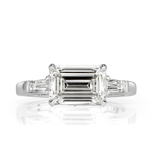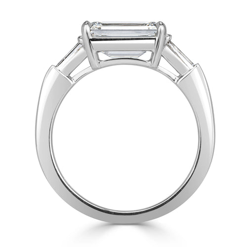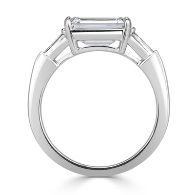 She will forever admire this exquisite three-stone emerald cut diamond ring designed and created to perfection. Showcased in the center is a 2.51ct emerald cut diamond GIA graded at G-VS1, very white and devoid of any visible inclusions. It possesses a desirable shape and the cut is extremely crisp. The two and a half carat center stone is adorned by two tapered baguette cut side diamonds, showcasing amazing finger coverage. This beauty is set in a luxurious platinum setting and will be eternally classic.