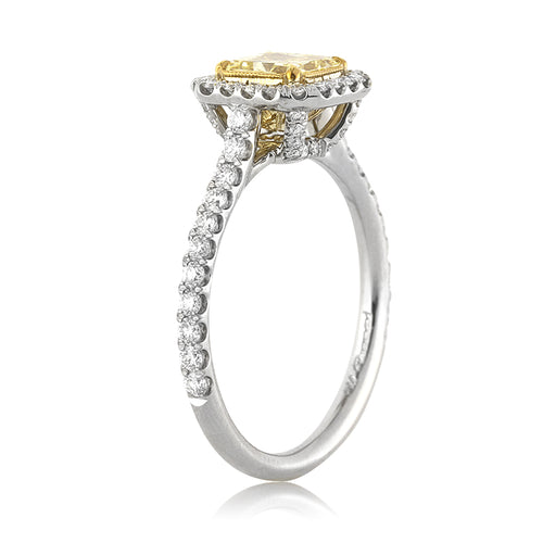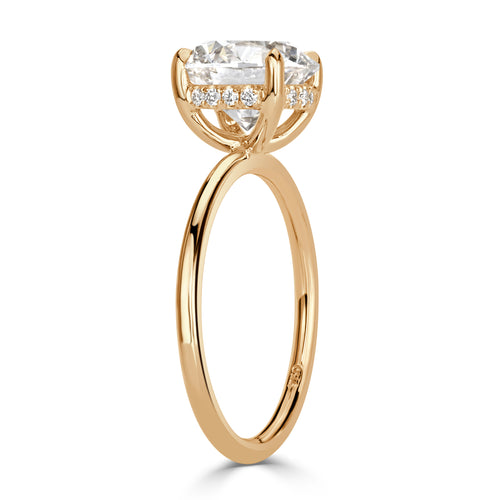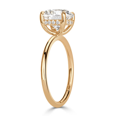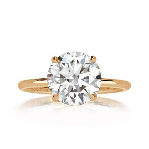 Here's a stunning yet classic solitaire diamond engagement ring that will have people staring! This gorgeous design showcases a 2.79ct round brilliant cut center diamond, GIA certified at L-VS2. This beauty is at an amazing value since it faces up more like a J colored diamond and shows up very white! It is completely eyeclean and graded excellent for cut, polish and symmetry. Measuring at 8.99mm, the perfect circle displays immense finger coverage! This elegant design truly lets the diamond do all the talking with it's classic solitiare design. The centerstone is set on a high polished 18k champagne yellow gold setting and is accented with shimmering round brilliant cut diamonds on our signature hidden halo design. Exceptional size, beauty and brilliance, all at an incredible value!