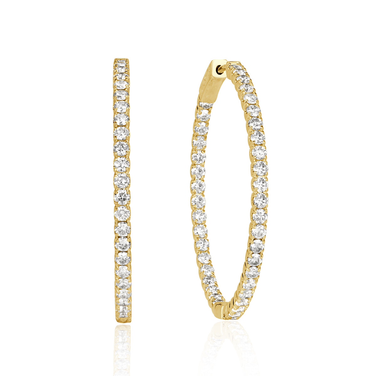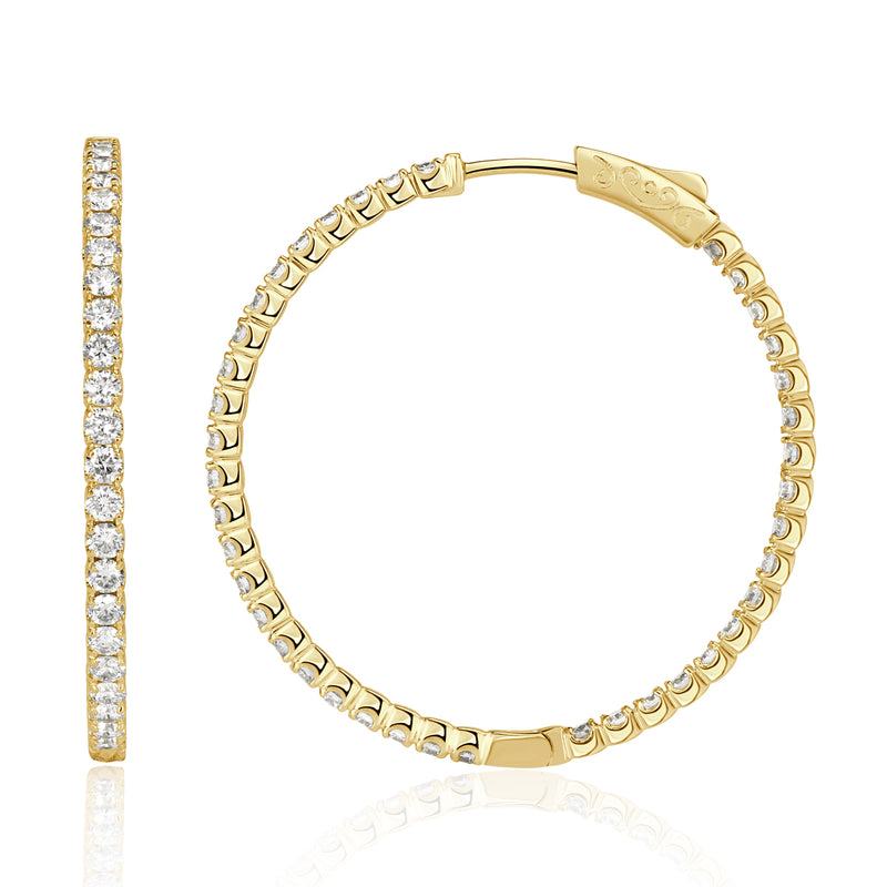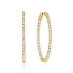 The 2.90ct Round Brilliant Cut Diamond Hoop Earrings offer the perfect balance of timeless elegance and modern sparkle. Set in luxurious 14k yellow gold and measuring 1.25 inches in diameter, they create a captivating display with diamonds set on both the front and inner side, ensuring a dazzling view from every angle. These earrings seamlessly transition from day to night, adding a touch of sophistication and brilliance to any ensemble. Perfect for those seeking luxury with a touch of classic charm.