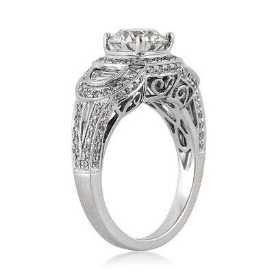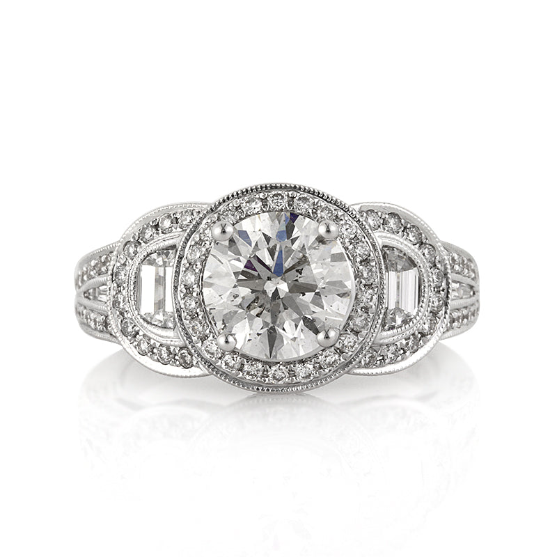 This unique, beautiful and exceptionally detailed round cut diamond ring will mesmerize you! The beautiful 1.63ct round brilliant cut center diamond is EGL certified, one of the leaders in diamond grading, at H-SI2. The almost 2 carat diamond is white and full of fire and shine. It is accented by a halo of round diamonds and flanked by two large step cut half moons with round diamonds pave set around them. The shank is set with two row of round diamonds in a pave setting with baguettes channel set in between. The front and back is elegantly designed with handmade filigree accents and pave set with round diamonds throughout. It is mesmerizing! This extraordinary piece is sure to get you compliments wherever you go!