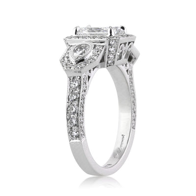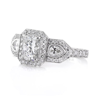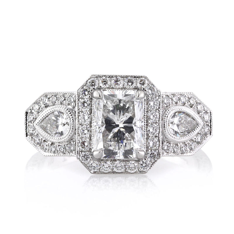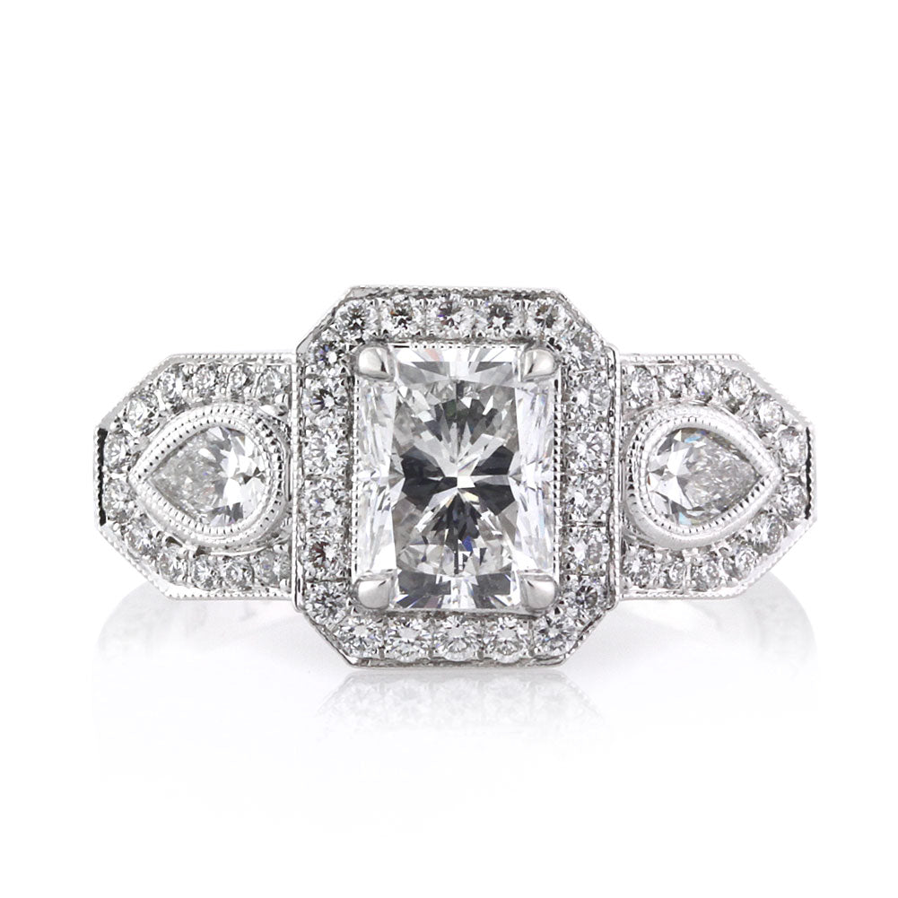 No matter how you view this custom-made radiant cut diamond engagement ring, you will see intricate fine detail and phenomenal quality. The superb 1.55ct radiant cut center diamond is GIA certified at D-SI2. The two large pear shaped side diamonds are set in a bezel setting and all three stones are accented by a halo of round diamonds in a pavé setting. The shank is pavé set with round diamonds on all three sides. The center basket is ornate and beautiful featuring a diamond studded filigree design. This mesmerizing radiant cut diamond engagement ring is one of a kind, like your sweetheart.