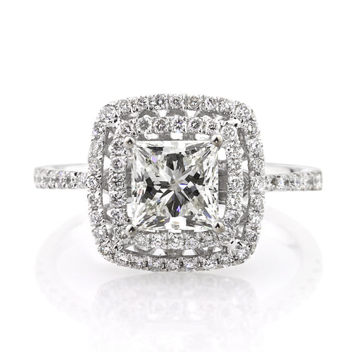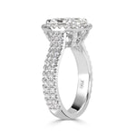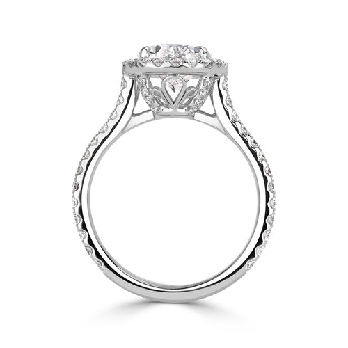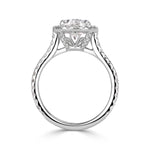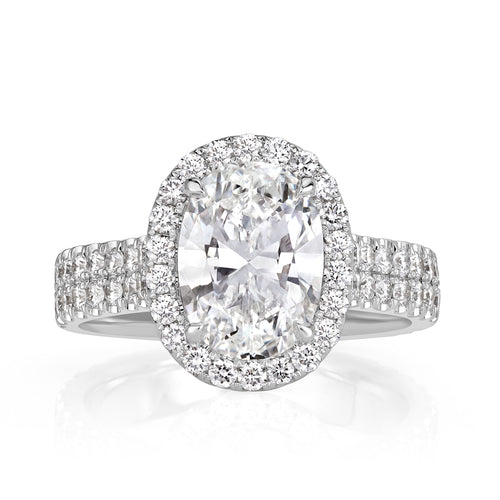 If you are looking for more sparkle in your life then this is the ring for you! Surrounded by a stunning pavé halo is a beautiful 2.01ct oval cut center diamond, GIA certified at F-IF. This stone is of an amazing value, facing up perfectly colorless and premium in clarity. It's handcrafted 18k white gold setting features two rows of round brilliant cut diamonds going down both sides of the centerpiece including delicate filigree details on the basket. Additional diamonds are set on the basket connectors for extra sparkle. This incredible oval cut diamond engagement ring will turn heads left and right!