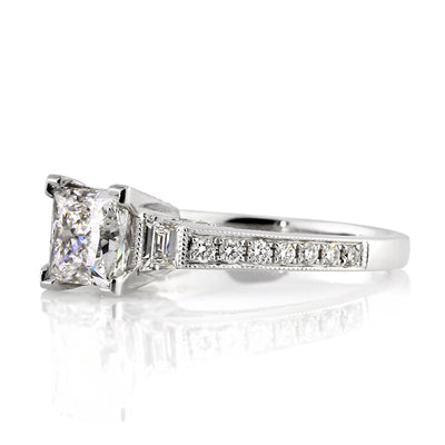 What a spectacular princess cut diamond engagement ring! This gorgeous piece features a 1.20ct princess cut diamond in the center. It is GIA certified at G-SI1, perfectly white and clear! The inclusion is a white feather; it looks like a VS1 even under 10X magnification! The cut is exceptional as well. It has tremendous brilliance. It is flanked by two trapezoid diamonds. The shank is set with a row of round diamonds in a pave setting. The center prongs and bridge are also studded with round diamonds in a pave setting. It is so beautiful! You are going to be in awe when you see this amazing piece in person!
