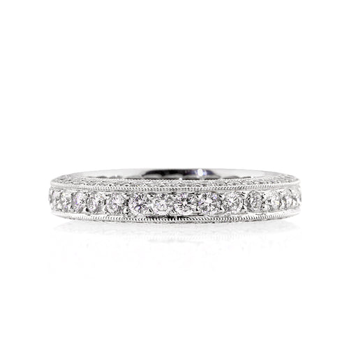 This gorgeous custom-made diamond eternity band sparkles from every angle. It is pave set on all three sides with round brilliant cut diamonds totaling 2.00ct. Each diamond is hand selected to match one another and every diamond is meticulously hand set to perfection. This gorgeous round diamond eternity ring will astonish you with its unique style and elegance. It sits great as a stand alone piece or as an accent to your engagement ring. Definitely a show stopper!
