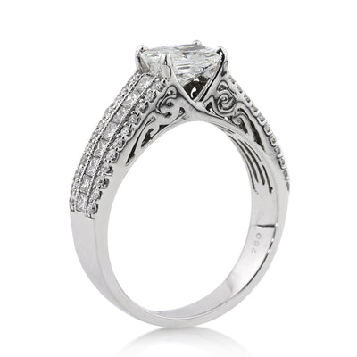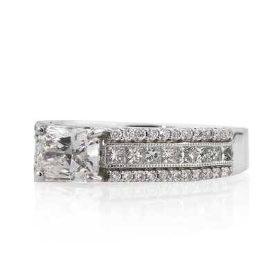 Radiant Cut Diamond set sideways! So immaculate! So beautiful! This stunning 0.96 Radiant Cut Diamond is certified by GIA (one of the leaders in diamond grading) at G-VS2 - White and very clear! The cut is stunning! It is accented by a row of Princess Cut Diamonds channel set in between two rows of Round Diamonds. The brilliance this amazing ring creates is outstanding! Elongated diamonds like Radiant Cuts set sideways gives you an amazing and unique feel for the diamond. This piece is extraordinary! Get ready for the fans and the compliments!!