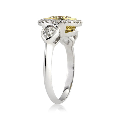 This rare and exceptionally beautiful antique European cut round diamond ring is mesmerizing! The 1.29ct European round cut center is EGL certified (one of the leaders in diamond grading) at Fancy Yellow VS1. It has a very vibrant and beautiful fancy yellow color and it is perfectly clear under 10X magnification! The larger and more pronounced facets reflect light in a spectacular manner! It is bezel set with a halo of round diamonds set around it. There are two large pear shaped diamonds flanked on its sides in a bezel setting as well. The center basket is made in high polish 18K gold and hand engraved throughout. It is a work of art. This spectacularly unique and beautiful piece is sure to be treasured forever! Breathtaking!