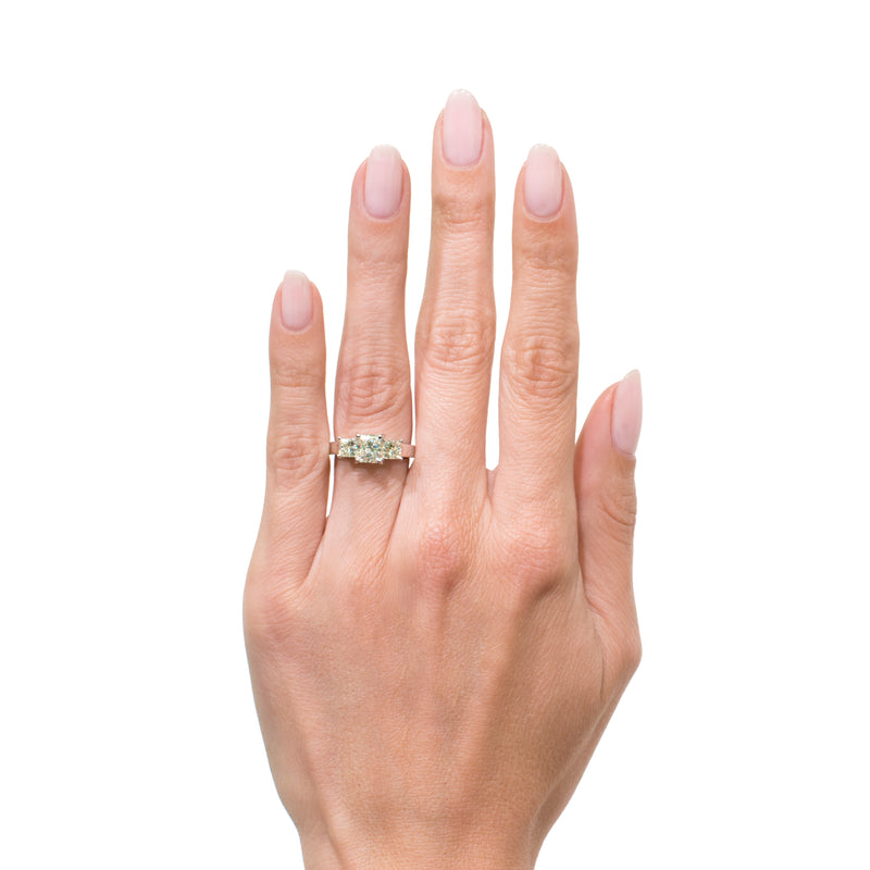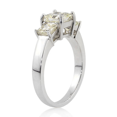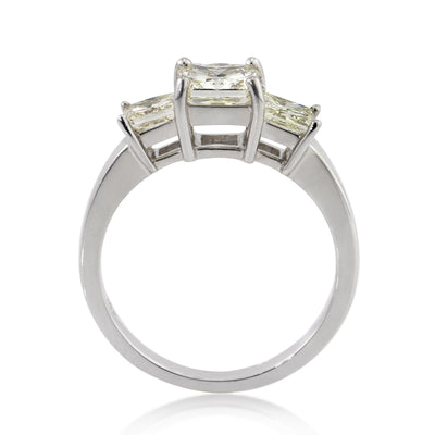 This elegant and beautiful three-stone diamond ring will astonish you with its beautiful brilliance and classic design! The 1.20ct radiant cut diamond set in the center is EGL certified at K-VS1. It has a warm color and is perfectly clear, even under 10X magnification. The cut is mesmerizing! It is flanked by two large princess cut diamonds and set on high polish 18K White gold. The combination of size, quality and brilliance make this piece an exceptional value! You will love to show off this magnificent three-stone ring, perfect for an engagement or anniversary ring!