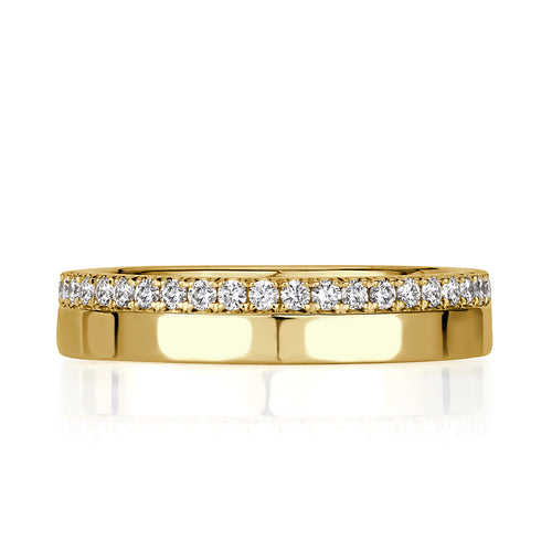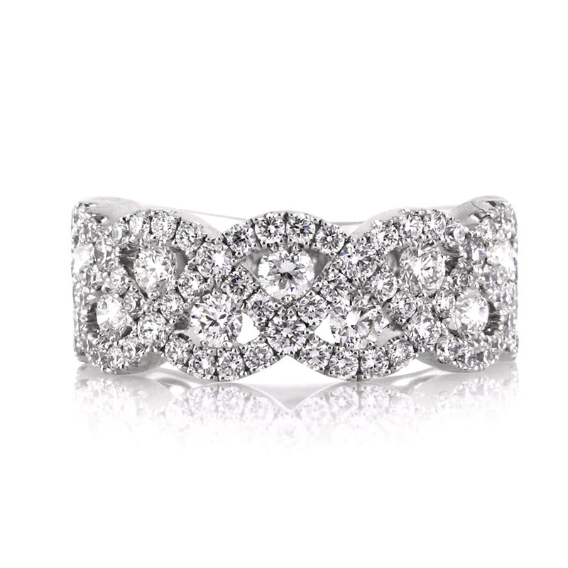 The lovely weaving nature of this round brilliant cut right-hand ring is capitivating. Almost two and a half carats of unbelievably white and clear diamonds are set in this incredible micro pavé setting. Larger round brilliant cut diamonds are intertwined in the waves of smaller diamonds. The diamonds are set to about three-quarters of the way down this 14k white gold band. Enjoy the compliments that will come with this stunning right-hand anniversary band.