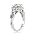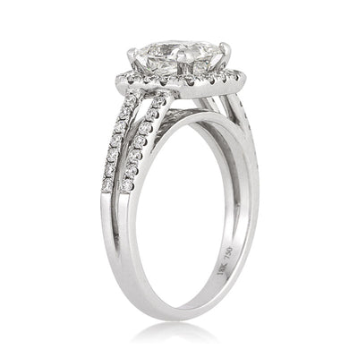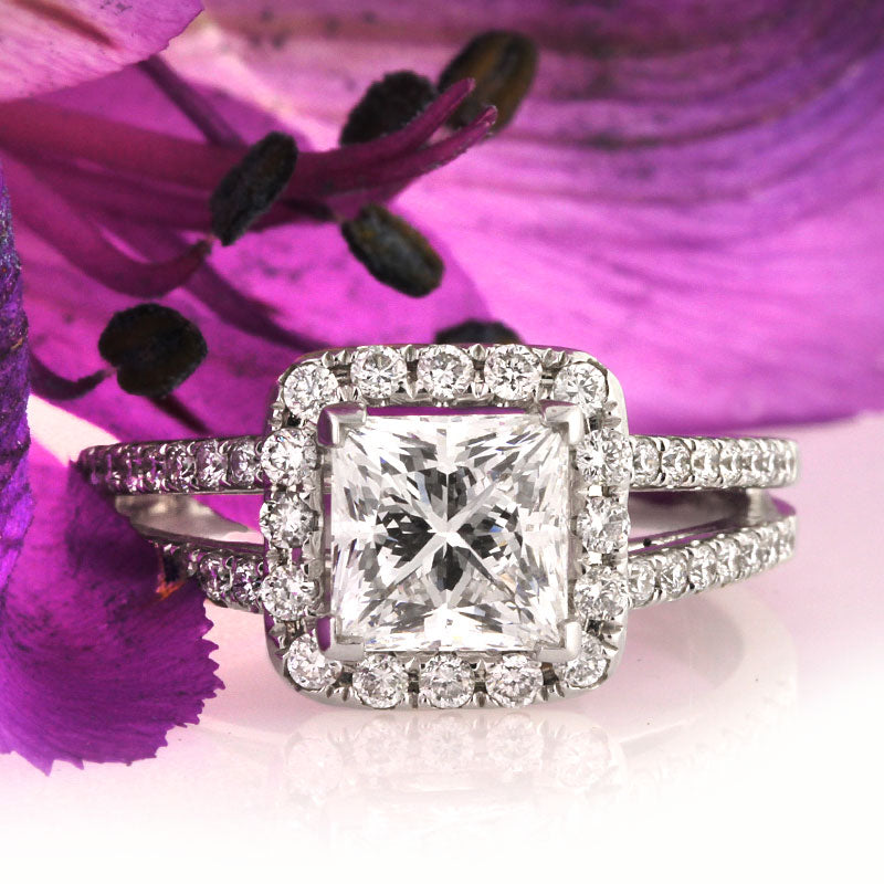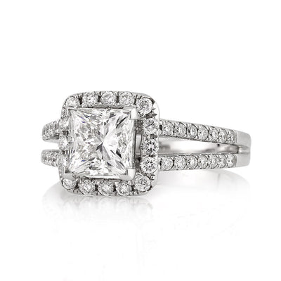 This sensationally beautiful princess cut diamond engagement ring is amazing in so many ways! The exceptionally beautiful 1.52ct princess cut diamond set in the center is EGL certified (one of the leaders in diamond grading) at G-VS2, perfectly white and clear! The cut of this diamond is magical! It has such outstanding brilliance! It is set in an 18K white gold setting featuring a halo of round diamonds set around it and a split shank which is also set with round diamonds. The ring sits on the finger so beautifully and showcases the center diamond perfectly! Fit for a princess!