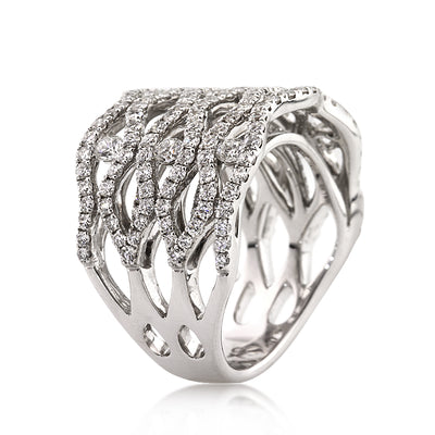 You can really call this incredible round diamond ring a masterpiece! The intricate design features a layered ring which is set with super high quality round diamonds. All you see on this ring are stunning diamonds! It is intricately hand crafted to perfection with rows of round brilliant cut diamonds accented by larger round diamonds channel set in between for a look that will leave you speechless! You will cherish this unique piece forever!