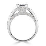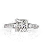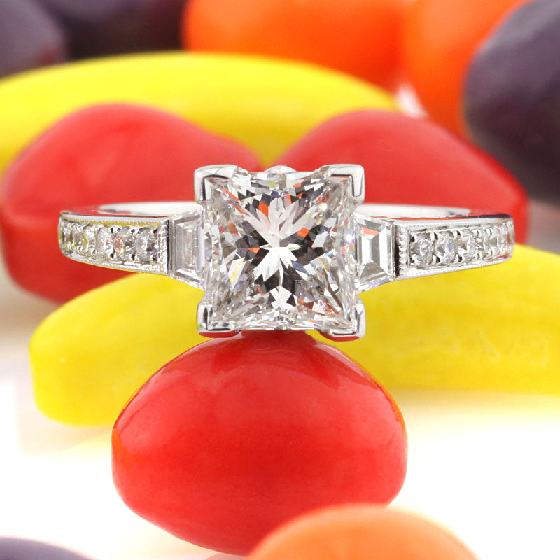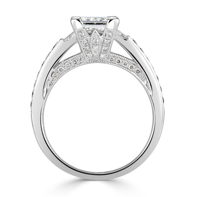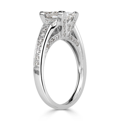 This magnificently beautiful princess cut diamond engagement ring will thrill you with its exceptional design, quality and brilliance! It all starts with the stunning 1.72ct princess cut diamond set in the center. It is GIA certified (one of the leaders in diamond grading) at G-SI1, white and perfectly eye clean! The cut is outstanding and it sparkles tremendously! It is flanked by two step cut trapezoid diamonds and followed by a row of round diamonds pave set down the shank. The front and back of the ring along with the center prongs are also studded with round diamonds. This piece is gorgeous from every angle! You will love to propose with this exceptional piece!