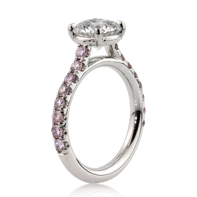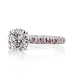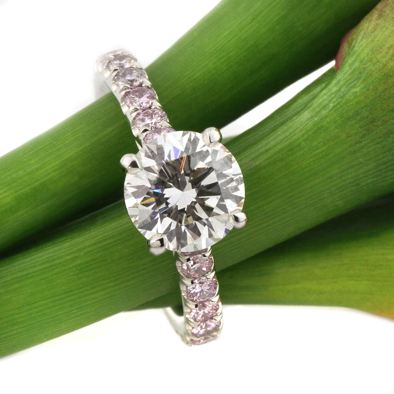 This one of a kind mesmerizing round brilliant cut diamond engagement ring will astonish you! It all starts with the incredible and rare 2.08ct round diamond set in the center. It is GIA certified at G-IF. It is very white and flawless! It is as close to perfect as you can get! This gorgeous diamond sparkles tremendously. It is accented by a row of natural fancy pink diamonds set in a micro pave setting. All you see are spectacularly beautiful diamonds with hardly any metal showing. This platinum piece is truly a masterpiece! You will cherish it forever!