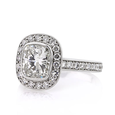 This astonishing cushion cut diamond engagement ring has such an exceptional combination at a great value! The 1.92ct cushion cut diamond set in the center is EGL certified (one of the leaders in diamond grading) at F-SI2, exceptionally white and extremely brilliant! The cut is outstanding! It has the crisp, clear facets that reflect light beautifully. It is bezel set in the center with a halo of round diamonds pave set around it. The sides of the ring are pave set with round diamonds as well. The center connectors are also studded with round diamonds for an added touch of brilliance. This gorgeous ring is so elegant and beautiful! You are going to get tons of compliments on it! Magnificent in every way!