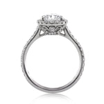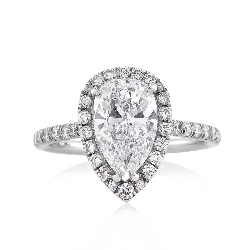 This very rare and incredibly difficult to find pear shaped diamond has an excellent quality combination! This two carat pear shaped diamond is GIA certified at D-VS1. It is the best, whitest color diamond you can get and perfectly clear, even under 10X magnification! The cut is astonishing. It has such immense brilliance and fire! The custom-made platinum setting features a halo of round diamonds set around the center in a micropave setting and a row set down the shank. The setting style is dainty, beautiful and showcases the diamonds perfectly with hardly any metal showing! The center basket features handmade filigree accents throughout with round diamonds studded on the connectors and in the beautiful gallery design on the rounded part of the basket. This is a one of a kind piece you won't be able to take your eyes off! Spectacular in every way!