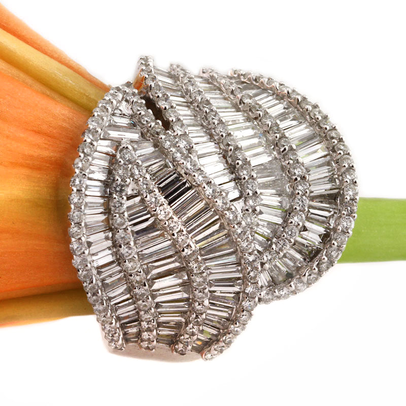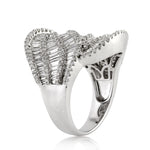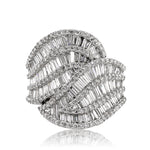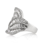 Radiant baguettes are at the center of this magnificent cocktail ring. The brilliance of the baguette and round brilliant cut diamonds in this ring is blinding! The diamonds are set in a beautiful fluid design on white gold. This ring is definitely a statement piece.