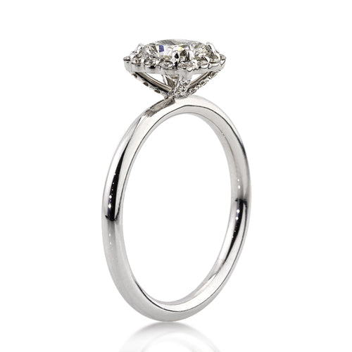 The fabulous combination of beautiful alexandrite and sparkling diamonds this engagement ring showcases is out of this world!  The 1.91ct oval cut alexandrite featured in the center is AGS certified and displays flashes of various colors when viewed at different angles. It is just like magic! This beauty is securely held by a double prong platinum setting and features accents of round brilliant cut diamonds on the halo and shank of the ring. The body of the ring is embellished with feminine detailing handcrafted to perfection. This artwork piece is of magnificent beauty and all at a phenomenal value!