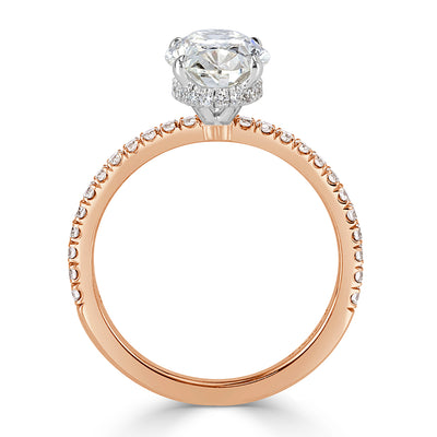 This magnificent two-toned oval cut diamond engagement ring is sure to leave you speechless! The gorgeous 2.47ct oval cut center diamond is GIA Certified at J-SI1. It is incredibly bright and extremely clear, even under 10X magnification with spectacular proportions of 10.48x7.57 mm. The rose and white gold setting is absolutely remarkable. It features a row of round brilliant cut diamonds set in a micro-pavé setting along the rose gold ring shank. While the prongs and hidden halo are expertly designed in high polish white gold for maximum brilliance. Sparkling from all angles this ring is so exceptionally beautiful!