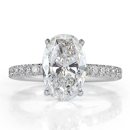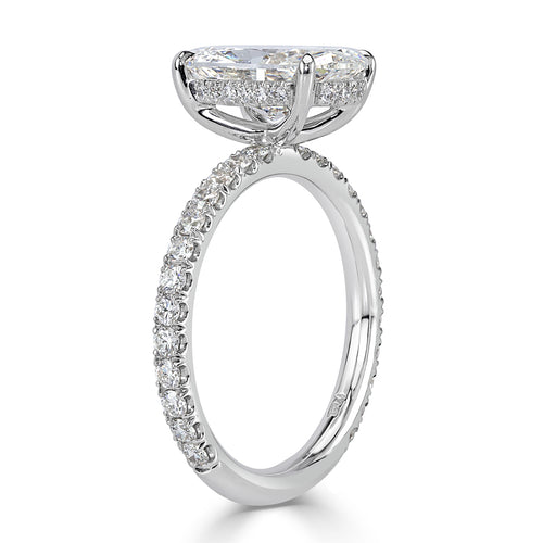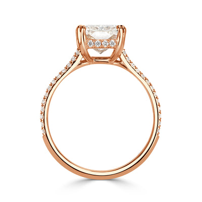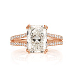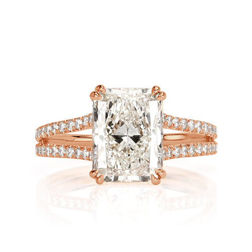 Look no further than this dreamy radiant cut diamond engagement ring! The stunning piece features a 2.57ct radiant cut diamond that is GIA certified at I-VS1 and graded at excellent in both polish and symmetry. The center diamond faces up a beautiful white color and is extremely clear. This incredible diamond measures 9.55x7.16mm and looks more like a 3ct+ stone! The unique split shank design on this ring is decorated with round brilliant cut diamonds in a micropave setting. For even more sparkle we added our signature hidden halo design underneath. A timeless piece that will be treasured forever, this is the ring for you!