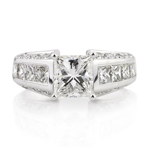 This remarkably beautiful princess cut diamond engagement ring is fit for a princess! It features a spectacularly brilliant 1.78ct princess cut diamond in the center. It is GIA Certified (one of the leaders in diamond grading) at H-VS2, white and perfectly clear! It is very hard to find diamonds within this weight range. You get the look of a two carat diamond without the added cost. It is accented by a row of large princess cut diamonds channel set down the center with a row of round diamonds pave set on each side of it. It has such a striking elegance to it! Mesmerizing in so many ways!
