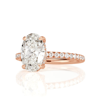 White diamonds and rose gold make the most perfect combination in this dreamy oval cut diamond ring design. The gorgeous 2.60ct oval cut diamond featured in the center is GIA certified at J-VS2, facing up a crisp white and perfectly eyeclean! Measuring at 11.66 x 7.34mm, this beauty displays an elongated coverage. It is also graded at excellence for polish and symmetry. The centerpiece sits on top our signature hidden halo detail in a feminine 18k rose gold setting. For extra shimmer, dainty round brilliant cut diamonds are micropavé set going down the shank 3/4 of the way down. This ravishing oval cut diamond engagement ring is a sparkling dream come true!